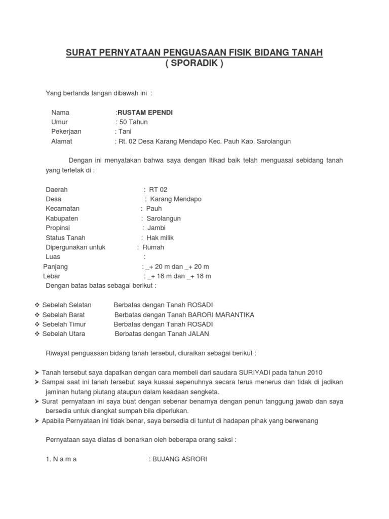 Contoh Surat Perjanjian Jual Beli Tanah. SURAT PERNYATAAN PENGUASAAN FISIK BIDANG TANAH SPORADIK Nomor. Biasanya dokumen ini diperlukan bagi penduduk-penduduk lokal yang belum melakukan sertifikasi terhadap tanah yang digarapnya.